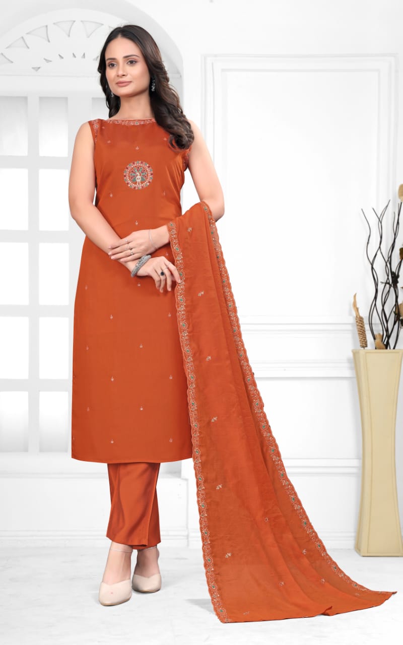 Enhance your ethnic wardrobe with this elegant Roman Silk suit set, crafted to offer both comfort and timeless style. Made from premium-quality Roman Silk fabric, this outfit features a smooth texture with a rich fall that adds a graceful look to every occasion.