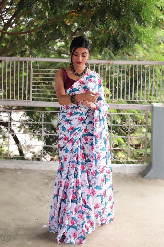 Purple And Pink Floral Designs Heavy Satin Sarees With Plain Blouse